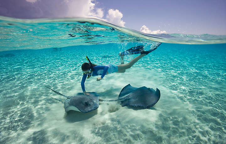 Le Cayman con Seven Mile Beach. Acqua trasparentissima, vicino al santuario delle tartarughe. Pini Australiani alle spalle, alcuni resorts alle estremità e sports acquatici per divertirsi.