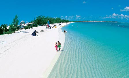 Turks and Caicos con Grace Bay. 20 km. di sabbia bianchissima, acqua calma, visibilità subacquea entusiasmante, barriera corallina a proteggerla. E' parco marino ma ci sono diversi resorts e ristoranti sulla battigia.